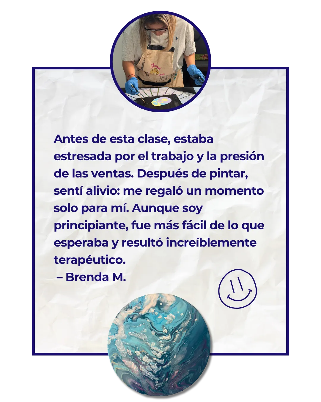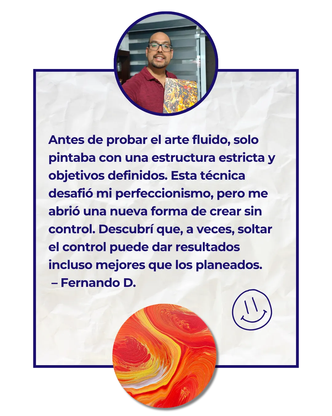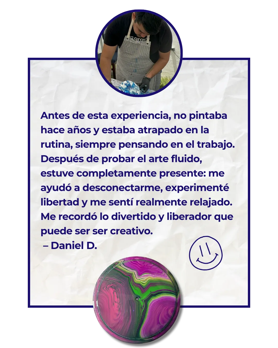 Antes de descubrir el arte fluido, pensaba que no tenía la habilidad para crear algo significativo. Ahora, pintar me ayuda a relajarme y expresar mis emociones. Mi concentración y mis niveles de estrés han mejorado, y espero con entusiasmo cada sesión — es mi tiempo para mí.