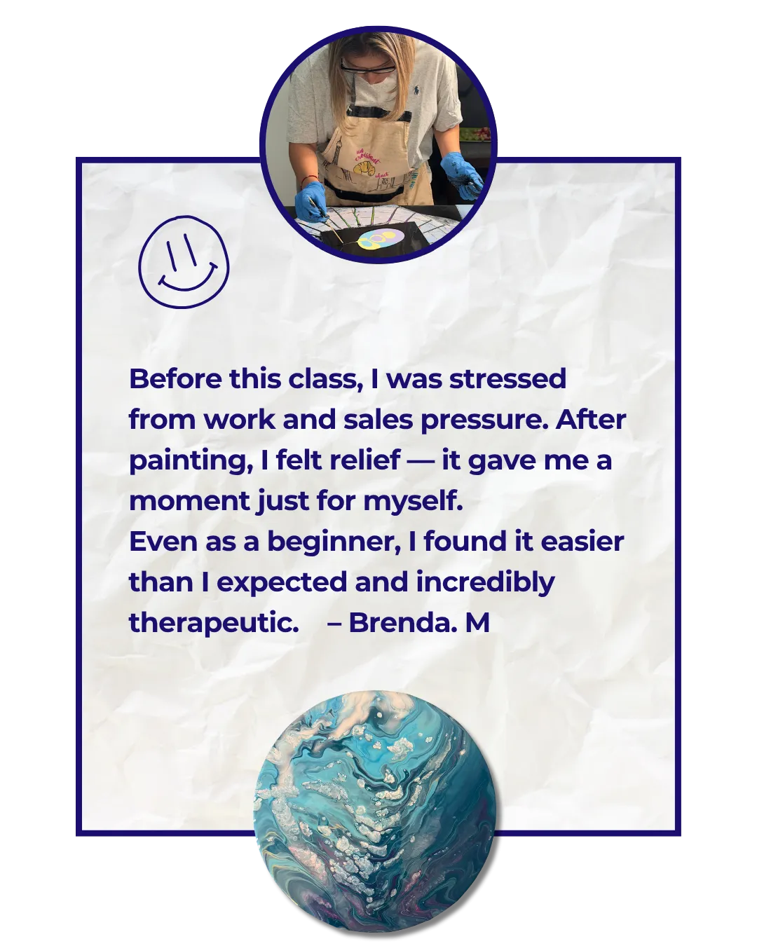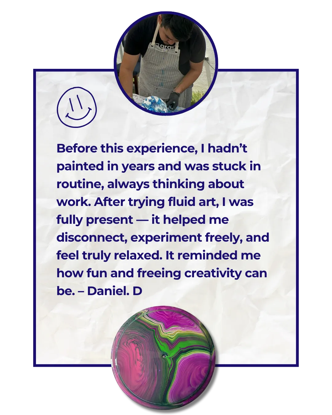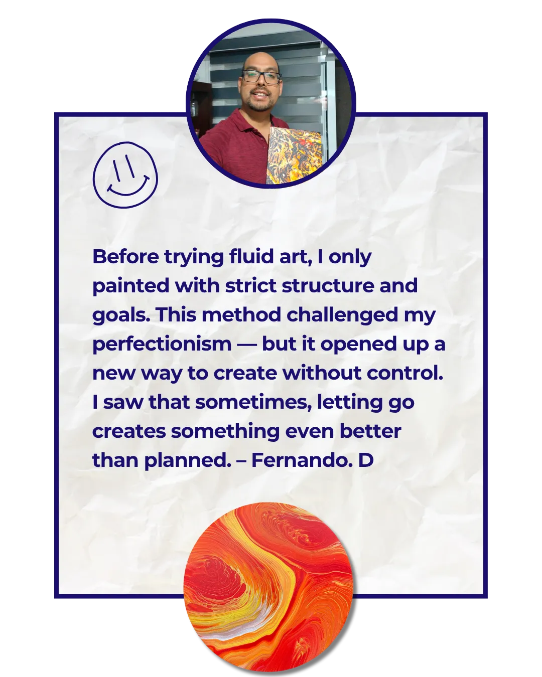 Before discovering fluid art, I didn’t think I had the skills to create something meaningful. Now, painting helps me relax and express my emotions. My concentration and stress levels have improved, and I look forward to every session — it’s my time for me.